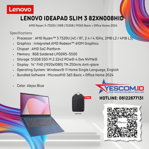 Rp 6.347.000 Rp 6.600.000Lenovo IdeaPad Slim 3 82XN008HID | AMD RYZEN 3-320U | 8GB | 512GB SSD | 14″ FHD IPS | Windows 11 Home+Office Home 2024+Microsoft 365 | [82XN008HID]