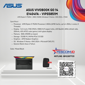 Rp 6.050.000 Rp 6.500.000Asus Vivobook Go 14 E1404FA VIPS5851M | AMD Ryzen 5-7520U | 8GB | 512GB SSD | 14″ FHD | Win 11 Home+OHS 2021+M365