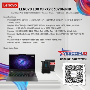 Rp 16.925.000 Rp 17.000.000Lenovo LOQ 15IRX9 83DV016NID | Intel Core i5-13450HX | 12GB | 512GB SSD | RTX3050 6GB | 15.6″ FHD | Win 11 Home +OHM 2024+M365 | Luna Grey