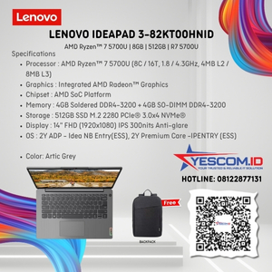 Rp 8.745.000 Rp 9.000.000Lenovo IdeaPad 3 – HNID (Arctic Grey) AMD Ryzen™ 7 5700U|8GB|512GB|AMD Radeon™ Graphics|Windows 11 Home + OHS 2021