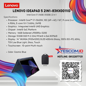 Rp 5.275.000 Rp 5.500.000Lenovo IdeaPad 5 2-in-1 14IRU9 – 83DT000BID (Cosmic Blue) Intel® Core™ 7 150U|16GB|256GB|Integrated Intel® Graphics|14″ WUXGA (1920×1200) IPS|Windows 11 Home + OHS 2021