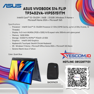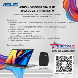 Rp 13.750.000 Rp 14.000.000ASUS Vivobook S14 Flip TP3402VA-VIPS5151TM | Intel® Core™ i5-13420H | 16 GB | 512 GB SSD | WIN 11 HOME + Microsoft Office Home 2024 + Microsoft 365 Basic