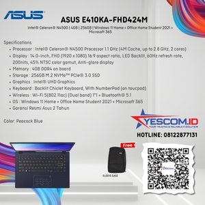 Spesifikasi Processor : Intel® Celeron® N4500 Processor 1.1 GHz (4M Cache, up to 2.8 GHz, 2 cores) Graphics : Intel® UHD Graphics Memory : 4GB DDR4 on board Storage : 256GB M.2 NVMe™ PCIe® 3.0 SSD Display : 14.0-inch, FHD (1920 x 1080) 16:9 aspect ratio, LED Backlit, 60Hz refresh rate, 200nits, 45% NTSC color…