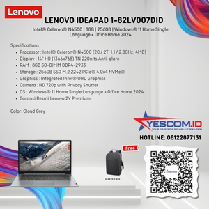 Rp 5.340.000 Rp 5.500.000LENOVO IDEAPAD SLIM 1 14IJL7 82LV007DID | N4500 | 8GB | 256GB | 14″ HD TN