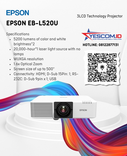 Projection Technology: Projection Technology:RGB liquid crystal shutter projection system (3LCD) Brightness*1: White Light Output (Normal/Eco):4,000 lmColour Light Output:4,000 lm Konektivitas: Antarmuka USB:USB Type A: 1 (For Wireless LAN, Firmware Update, Copy OSD Settings) USB Type B: 1 (For Firmware Update, Copy OSD Settings)Jaringan:Wireless: Optional (ELPAP11)Analog Input:Composite: 1 RCA D-Sub 15pin: 1Digital Input:HDMI: 1Audio Input:2RCA (White…