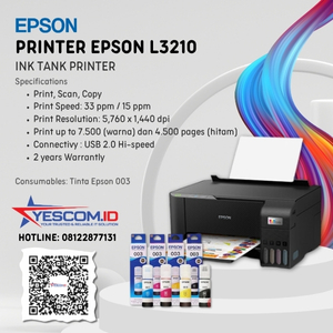 Tipe Printer: Tipe Printer:Cetak, Pindai, Salin Teknologi Pencetakan: Metode Cetak:On-demand inkjet (Piezoelectric)Bahasa Printer:ESC/P-R, ESC/P RasterKonfigurasi Nozzle:180 x 1 nozzles Black, 59 x 1 nozzles per Colour (Cyan, Magenta, Yellow)Resolusi Maksimum:5760 x 1440 dpiPencetakan Otomatis 2 Sisi:No Kecepatan Cetak: Default Foto – 10 x 15 cm / 4 x 6 “*2:Approx. 69 sec per photo (Border)…