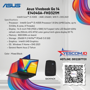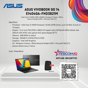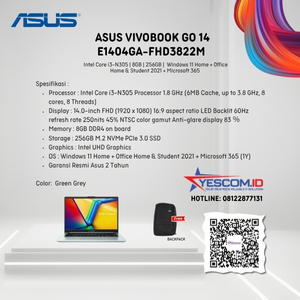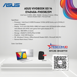 Rp 14.955.000 Rp 15.000.000Asus Vivobook GO 14 E1404GA FHD3821M | Intel Core I3-N305 | 8GB | 256GB SSD | Win 11 Home + OHM 2021 + M365(1Y