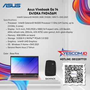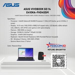 Rp 20.455.000 Rp 21.000.000Asus Vivobook Go 14 E410KA FHD455M | N4500 | 8GB | 512GB SSD | 14″ FHD | Win 11 Home+OHS 2021+M365
