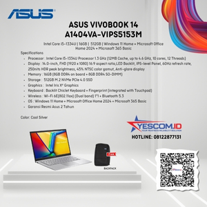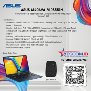 Rp 5.165.000 Rp 5.500.000Asus Vivobook 14 A1404VA VIPS5153M | Core i5-1334U | 16GB | 512GB SSD | 14″ FHD IPS | Win 11 Home+OHS 2021+M365 | [A1404VA-VIPS5153M]