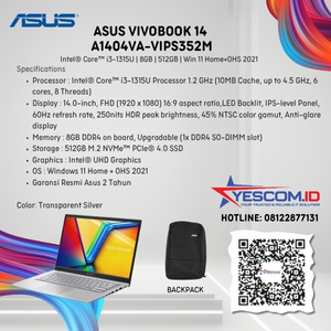 Rp 8.905.000 Rp 9.200.000Asus Vivobook 14 A1404VA VIPS352M | Core i3-1315U | 8GB | 512GB SSD | 14″ FHD IPS | Win 11 Home+OHS | OPI+M365 | [A1404VA-VIPS352M]