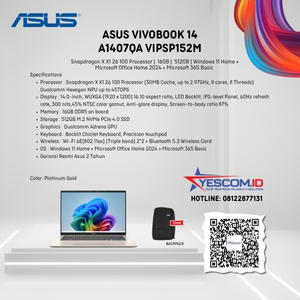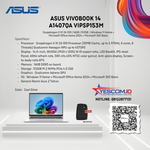 Rp 10.060.000 Rp 10.200.000Asus Vivobook 14 A1407QA VIPSP153M | Snapdragon X1 | 16GB | 512GB SSD | 14″ WUXGA IPS | Win 11 Home+OHM 2024+M365 [A1407QA-VIPSP153M]