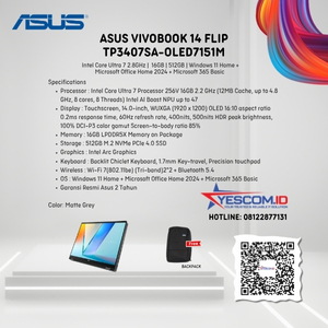 Rp 5.000.000 Rp 5.500.000Asus Vivobook 14 Flip TP3407SA-OLED7151M | Ultra 7 256V | 16GB | 512GB SSD | 14″ WUXGA OLED Touch | Win 11 Home+OHS 2021+M365 | Matte Grey