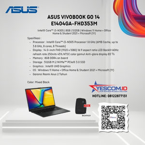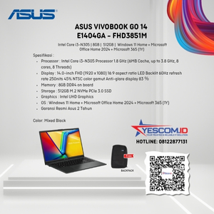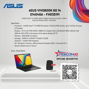 Rp 11.545.000 Rp 12.000.000Asus Vivobook Go 14 E1404GA FHD351M | Core i3-N305 | 8GB | 512GB SSD | 14″ FHD | Win 11 Home+OHS 2021+M365