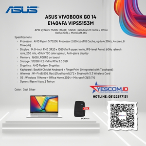 Rp 5.045.000 Rp 5.500.000Asus Vivobook Go 14 E1404FA VIPS5153M |Ryzen 5-7520U | 16GB | 512GB SSD | 14″ FHD IPS | Win 11 Home+OHM 2024+M365 [ E1404FA-VIPS5153M]
