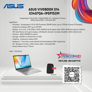 Rp 11.105.000 Rp 11.500.000Asus Vivobook S14 S3407QA IPSP152M | Snapdragon X1 | 16GB | 512GB SSD | 14″ 2.5K IPS | Win 11 Home+OHM 2024+M365 [S3407QA-IPSP152M]