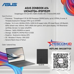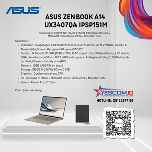 Rp 8.465.000 Rp 8.700.000Asus Zenbook A14 UX3407QA IPSP152M | Snapdragon X1 26 100 | 16GB | 512GB SSD | 14″ WUXGA IPS | Win 11 Home+OHM 2024+M365 | UX3407QA-IPSP152M]