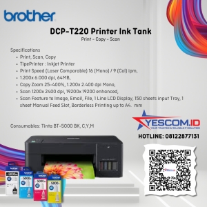 Printer Brother DCP-T220 Ink Tank Multi-function Printer – NEW SERIES Basic Specs : FUNCTIONS : Print,Scan,Copy PRINTER TYPE : Ink Tank Printer PRODUCT DIMENSIONS (WIDTH X DEPTH X HEIGHT) : 435 mm x 359 mm x 159 mm PRINT SPEED : 16 (Mono) / 9 (Col) ipm FPOT: 6.5 (Mono) / 10 (Col) seconds PAPER…