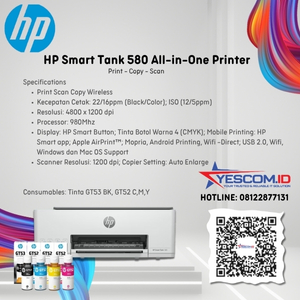 Rp 1.900.000 Rp 2.500.000HP Printer Smart Tank 580 AIO Wireless (Print – Scan – Copy) SmartTank 585 All In One