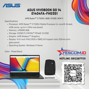 Rp 6.265.000 Rp 7.000.000Asus Vivobook Go 14 E1404FA-FHD351 (Mixed Black) AMD Ryzen™ 3 7320U|8GB|512GB|AMD Radeon™ Graphics|Windows 11 Home + OHS 2021
