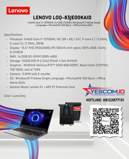 Rp 13.915.000 Rp 14.000.000Lenovo LOQ 15IRX9 6PID | Intel i7 13650HX | 12GB | SSD 512GB | RTX4050 |15.6″FHD | W11+OHS2024+M365