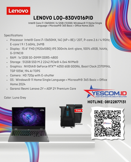 Lenovo LOQ 15IRX9-83DV00AAID | Core i5-13450HX | 12GB | 512GB SSD | RTX4050 6GB | 15.6″ FHD 144Hz | Win 11 Home+OHS 2021 | Luna Grey