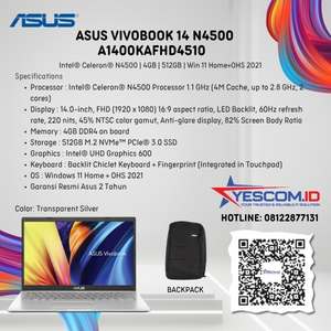Rp 6.540.000 Rp 6.800.000ASUS Vivobook14 A1400KA-FHD4510 (Transparent Silver) Intel® Celeron® N4500|4GB|512GB SSD|Intel UHD Graphics|Windows 11 Home + OHS 2021