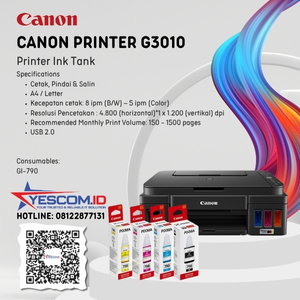 Canon PIXMA G3010 InkTank All In One Printer | Print, Scan, Copy, Wifi PIXMA G3010 BRAND : CANON SERIES : PIXMA G3010 PLATFORM : Ink Tank CONSUMABLES : 790 (BLACK), 790 (COLOR) MAX PRINT RESOLUTION : 4800 (horizontal)*1 x 1200 (vertikal) dpi MAX PAPER PRINT SIZE : Pencetakan Batas Tepi: Hingga 203,2 mm (8 inci),…