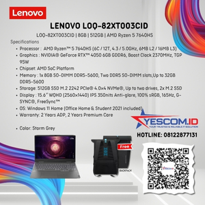 Rp 17.400.000 Rp 17.800.000Lenovo LOQ 15APH8-82XT003CID (Storm Grey) AMD Ryzen™ 5 7640HS|8GB|512GB|NVIDIA® GeForce RTX™ 4050 6GB GDDR6|15.6″ WQHD IPS 165Hz|Windows 11 Home + OHS 2021