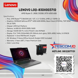 Lenovo LOQ 15AHP9-83DX0037ID (Luna Grey) LOQ 15AHP9-83DX0037ID – Luna Grey BRAND : LENOVO TYPE & MTM : LOQ 15AHP9-83DX0037ID – Luna Grey PROCESSOR : AMD Ryzen™ 5 8645HS (6C / 12T, 4.3 / 5.0GHz, 6MB L2 / 16MB L3) GRAPHICS : NVIDIA® GeForce RTX™ 4050 6GB GDDR6, Boost Clock 2370MHz, TGP 105W MEMORY (RAM) :…
