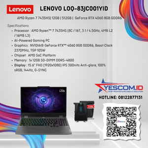 Lenovo LOQ 15ARP9-83JC001YID (Luna Grey) AMD Ryzen™ 7 7435HS|12GB|512GB|NVIDIA® GeForce RTX™ 4060 8GB GDDR6|15.6″ FHD (1920×1080) IPS 144Hz|Windows 11 Home + OHS 2021