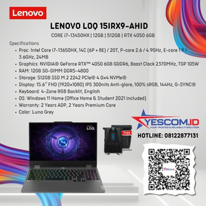 Lenovo LOQ 15IRX9-83DV00AHID (Luna Grey) LOQ 15IRX9-83DV00AHID – Luna Grey BRAND : LENOVO TYPE & MTM : LOQ 15IRX9-83DV00AHID – Luna Grey PROCESSOR : Intel® Core™ i7-13650HX, 14C (6P + 8E) / 20T, P-core 2.6 / 4.9GHz, E-core 1.9 / 3.6GHz, 24MB GRAPHICS : NVIDIA® GeForce RTX™ 4050 6GB GDDR6, Boost Clock 2370MHz, TGP 105W…