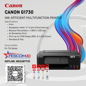 Canon PIXMA G1730 Inktank Printer | Print PIXMA G1730 BRAND : CANON SERIES : PIXMA G1730 PLATFORM : Ink Tank CONSUMABLES : GI-71s(BLACK & COLOR), GI-71(BLACK & COLOR) MAX PRINT RESOLUTION : 4800 (horizontal)*1 x 1200 (vertikal) dpi MAX PAPER PRINT SIZE : Pencetakan Batas Tepi: Hingga 203,2 mm (8 inci), Tanpa Tepi: Hingga 216…